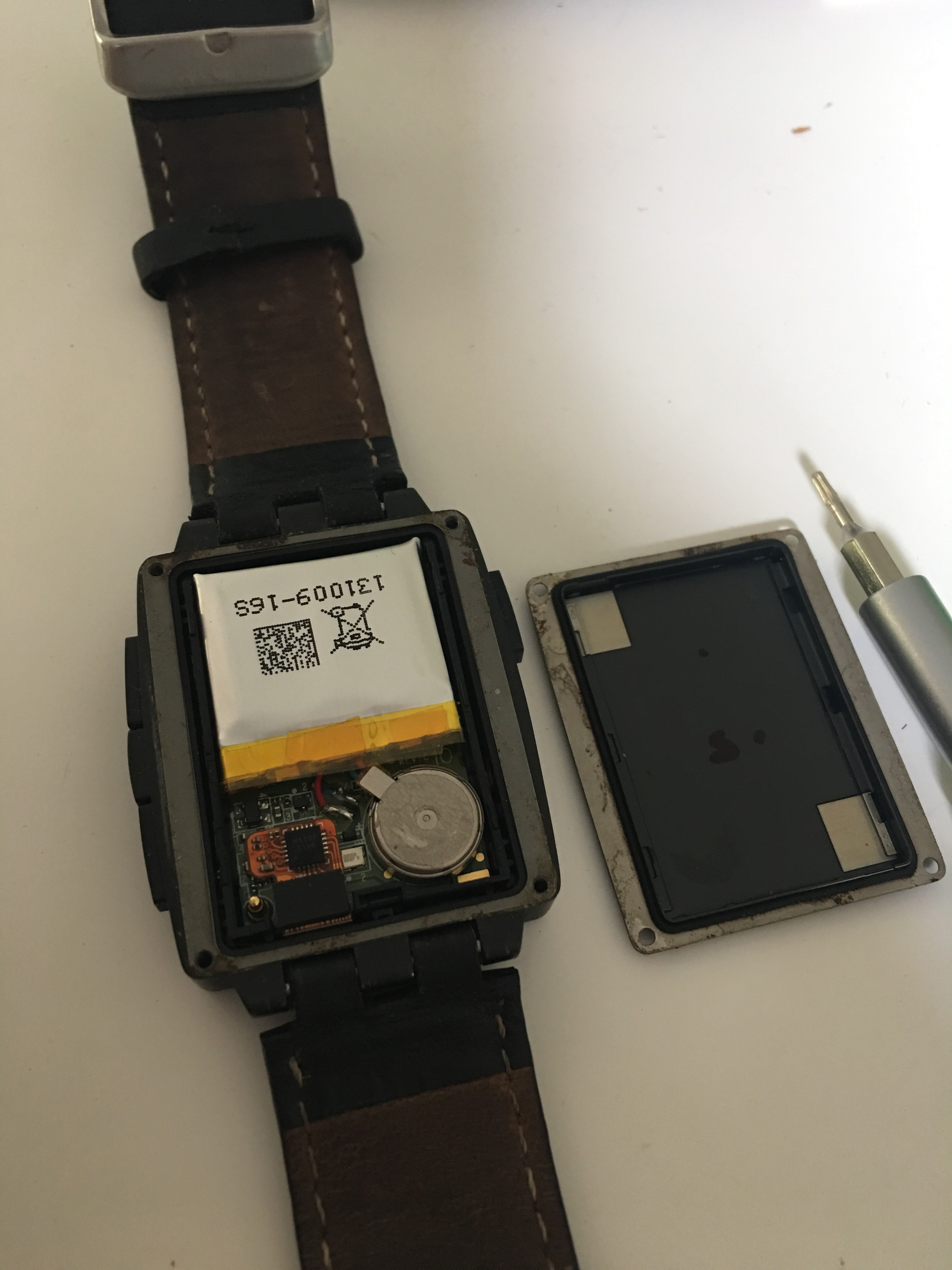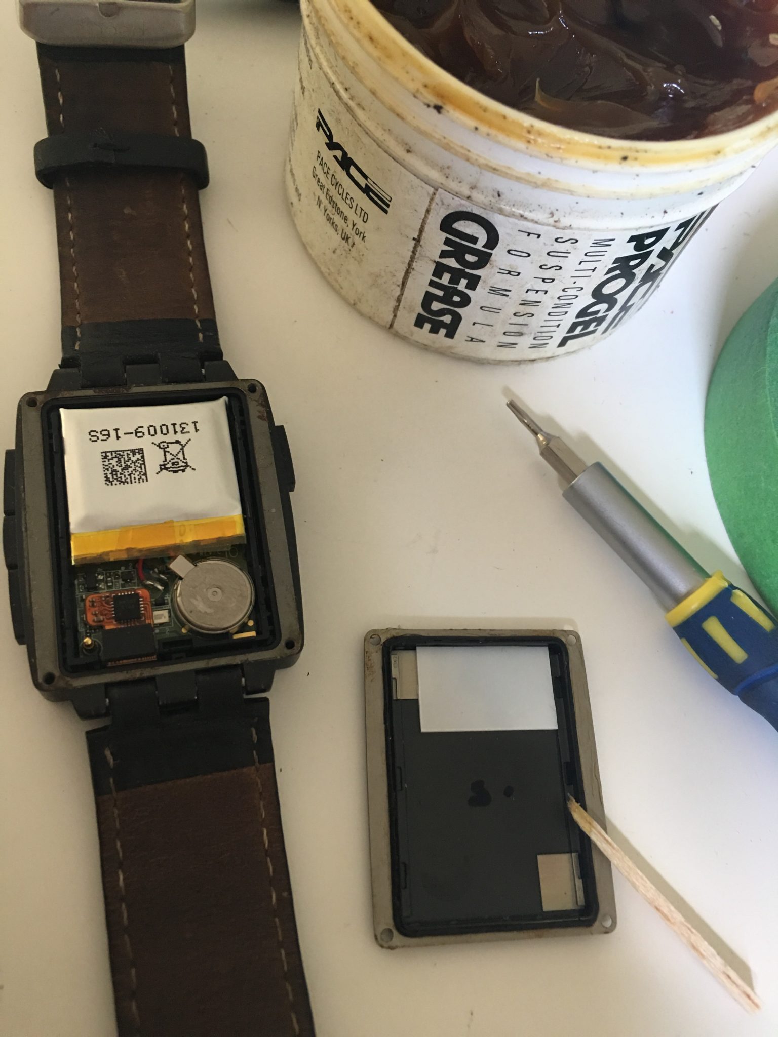 Here’s my problem. This is a first gen Steel, so is now nigh on three years old. It was actually replaced under warranty by Pebble for this problem but has been sat in my drawer since. I thought I’d have a go at fixing it and having a google found I could.